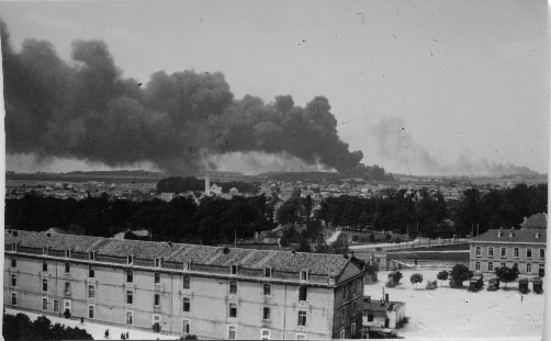 Incendie volontaire des réserves d'essence et de fioul par les armées françaises pour ne pas le donner aux allemands au nord de La Rochelle en juin 1940. La vue est prise des casernes Renaudin (pendant la guerre tous les régiments étaient là)