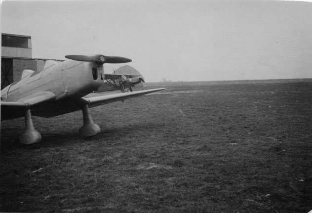 Avion civil et Fieseler Fi 156 devant des hangars à La Rochelle pendant la Seconde Guerre Mondiale