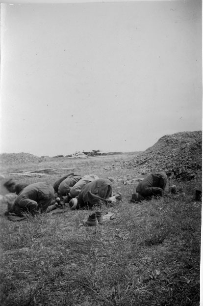 Soldats nord-africains prisonniers priant la tête vers la Mecque dans un camp de prisonniers pendant la Seconde Guerre Mondiale en 1940 en France