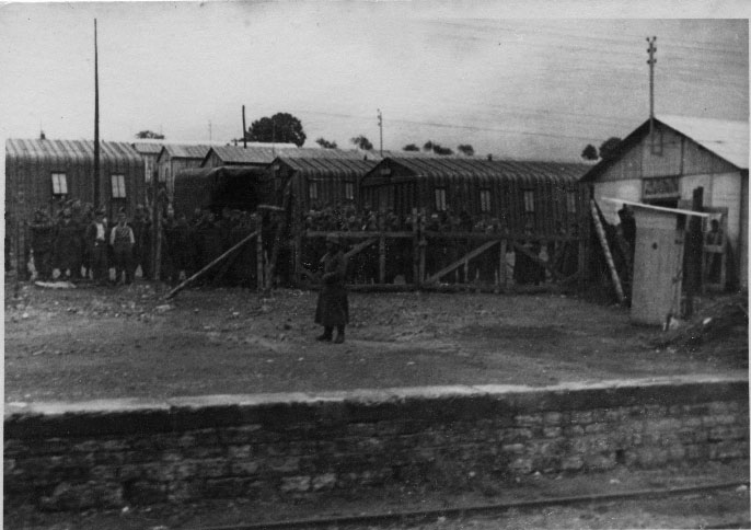 Prisonniers français dans un des rares camp de prisonniers à Surgères près d'une voie ferrée pendant la seconde guerre mondiale en 1940