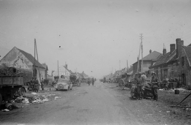 Avenue du nord de la France bordée de déchets et matériel abandonné pendant la Seconde Guerre Mondiale en 1940