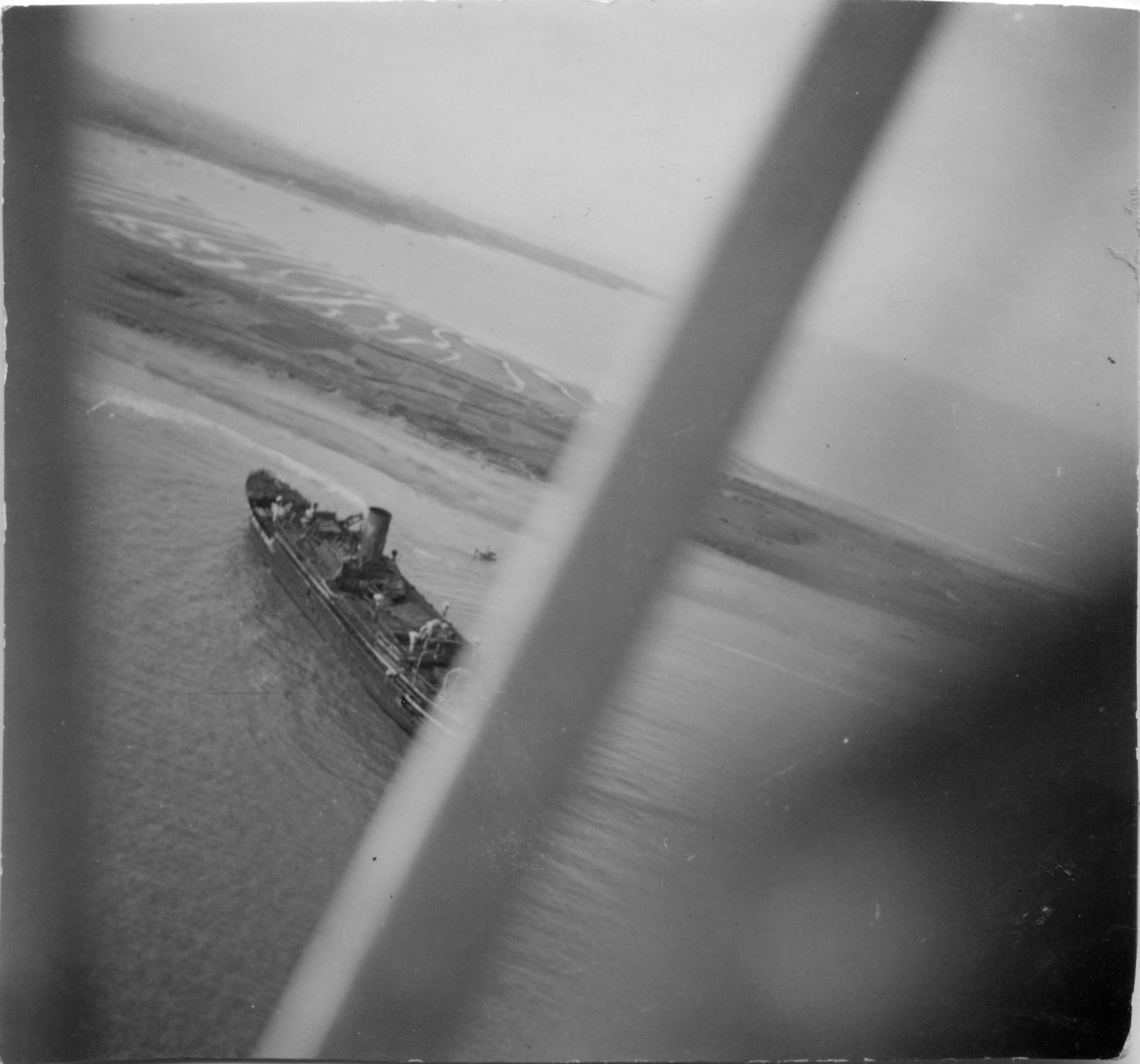 Vue aérienne du paquebot Foucault échoué sur le plage de Sablanceaux en mai 1942 à Rivedoux-Plage sur l'île de Ré