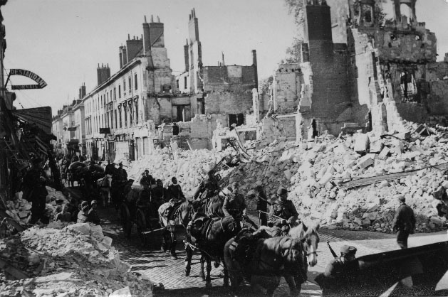 Convoi hippomobile allemand traversant un village en ruine en juin 1940 en France