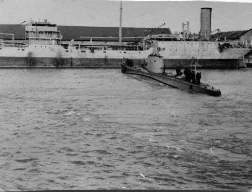 Sous-marin italien manoeuvrant devant un Sperrbrecher dans le port de La Pallice à La Rochelle entre 1941 et 1942