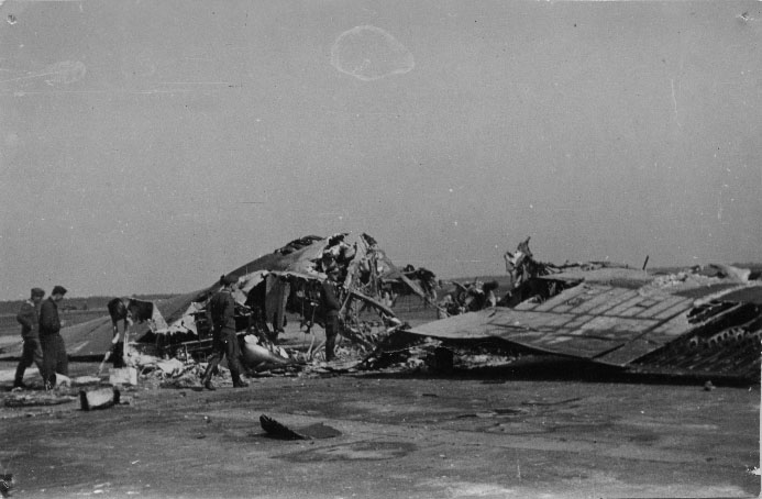 Soldats allemands autour de la carcasse d'un avion bombardier abattu en France en 1940