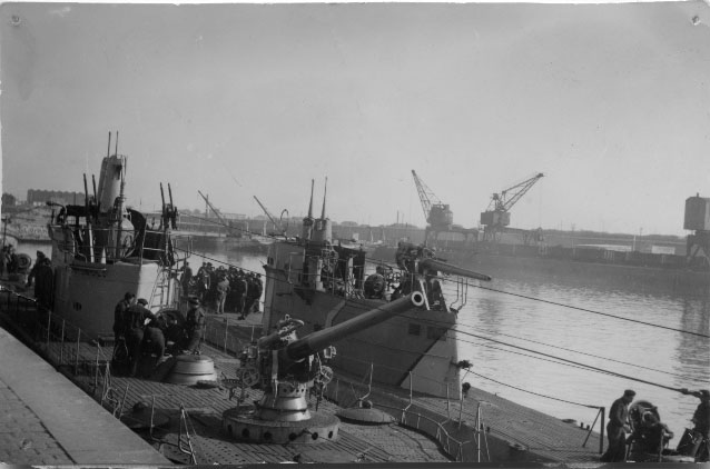 Deux sous-marins italiens à quai avec des hommes sur le pont dans le port de La Pallice à La Rochelle en 1941