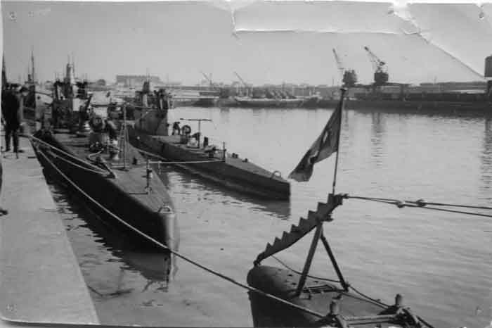 Deux sous-marins allemands U.Boote et un sous-marin italien (au premier plan) dans le port de La Pallice à La Rochelle entre 1941 et 1942 pendant la Seconde Guerre mondiale. Après 1942 les sous-mariniers allaient directement dans la base sous-marine pour se protéger, celle-ci ne devait alors pas être terminée.