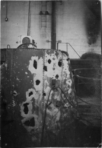 Kiosque d'un sous-marin U-Boot revenant d'un raid dans l'Atlantique. Il est sous la base sous-marine de La Pallice et couvert d'impacts de mitrailleuses d'avion à La Rochelle entre 1942 et 1944 pendant la Seconde Guerre mondiale.