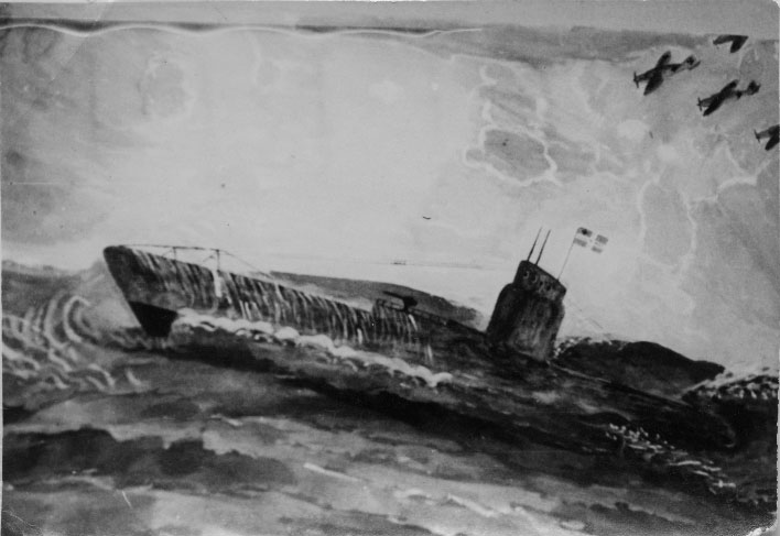Fresque peinte par les Allemands représentant un sous-marin italien survolé par des avions allemands à La Rochelle entre 1940 et 1944pendant la Seconde Guerre mondiale.