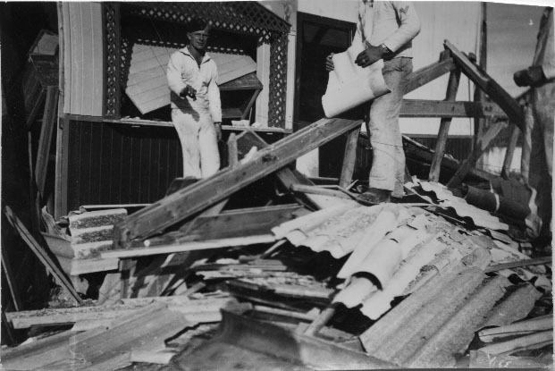 Marins allemands fouillant parmi les débris suite à un bombardement à Laleu entre 1943 et 1944 pendant la Seconde Guerre mondiale.