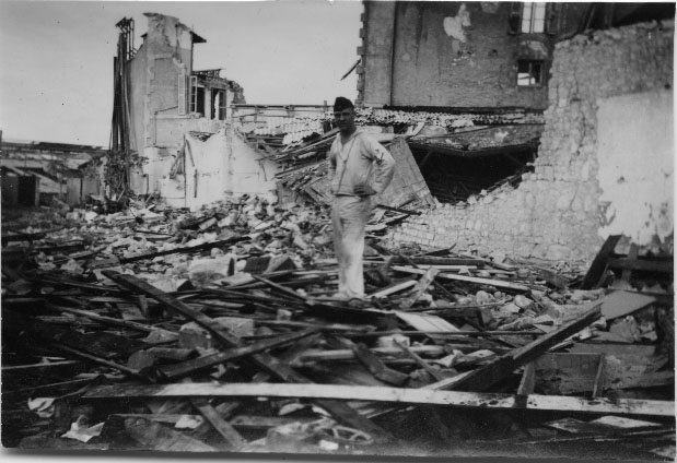Marin allemand au milieu de ruines suite à un bombardement à Laleu ou La Pallice à La Rochelle entre 1943 et 1944