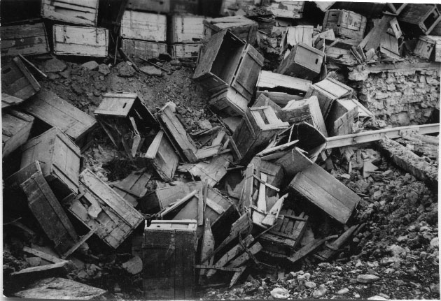 Caisses en bois éclatées à la suite d'un bombardement à La Pallice à La Rochelle entre 1943 et 1944