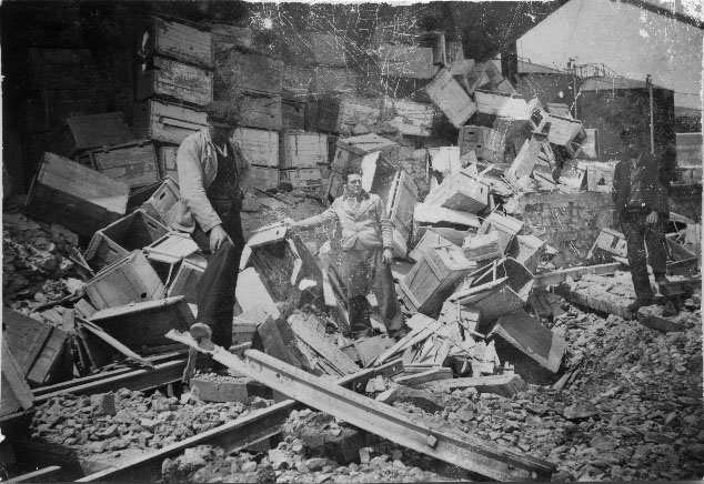 Trois français réquisitionnés pour ramasser les débris d'un bombardement à La Pallice à La Rochelle entre 1943 et 1944 pendant la Seconde Guerre mondiale. Des morceaux de rails ont volé en éclats.