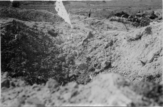 Canon d'artillerie allemand au milieu d'un cratère suite à un bombardement