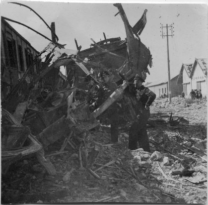 Train démantelé par un bombardement visant la base sous-marine de La Pallice à La Rochelle entre 1943 et 1944 pendant la Seconde guerre mondiale.