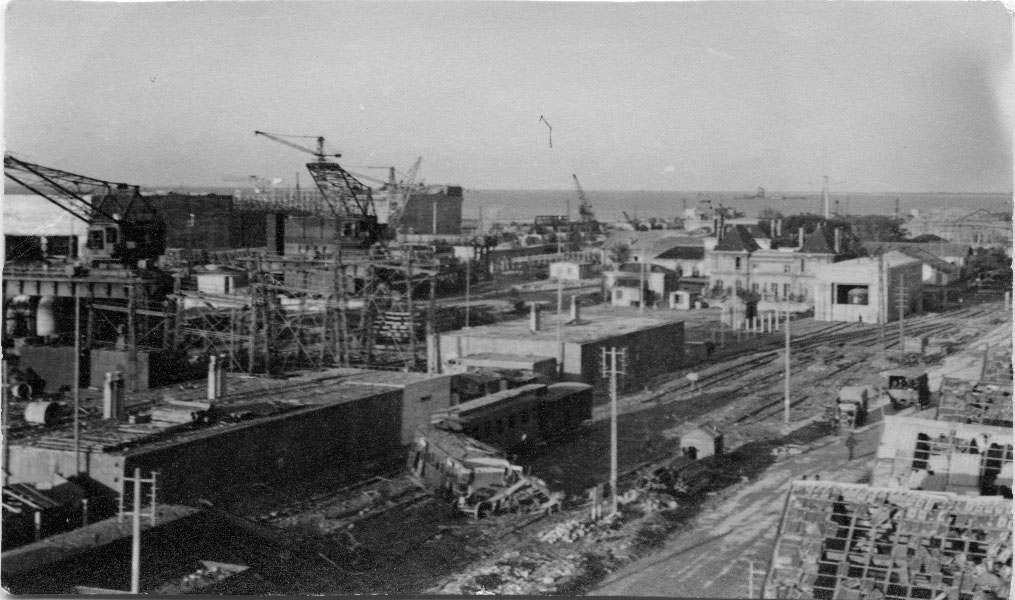 Vue aérienne des entrepôts et des chemins de fer bombardés à La Pallice à La Rochelle entre 1943 et 1944 pendant la Seconde Guerre mondiale.