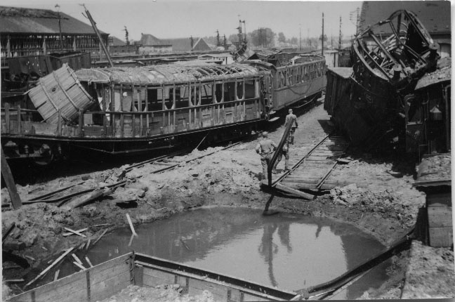 Cratère d'une bombe au milieu de carcasses de wagon à La Rochelle entre 1943 et 1944
