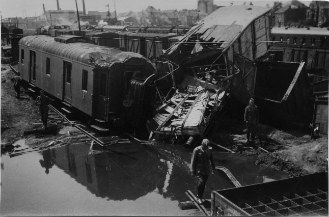 Cratères de bombes au milieu de carcasses de wagon à La Pallice à La Rochelle entre 1943 et 1944
