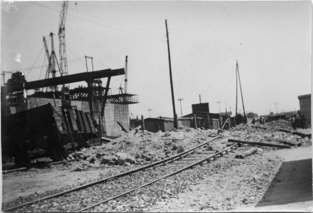 Voies de chemin de fer bombardées à La Pallice à La Rochelle en 1941 pendant la Seconde Guerre mondiale. On aperçoit le U-bunker en cours de construction, et notamment les poutres métalliques très caractéristiques constituant la première dalle du toit.