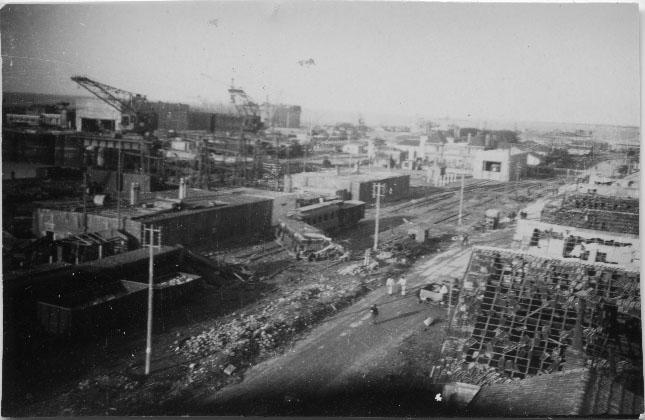 Vue sur les bunkers LS 10 et 11 après le bombardement de La Pallice à La Rochelle entre 1943 et 1944. Au fond, on peut voir le bunker pour locomotive et le sas en cours de construction.