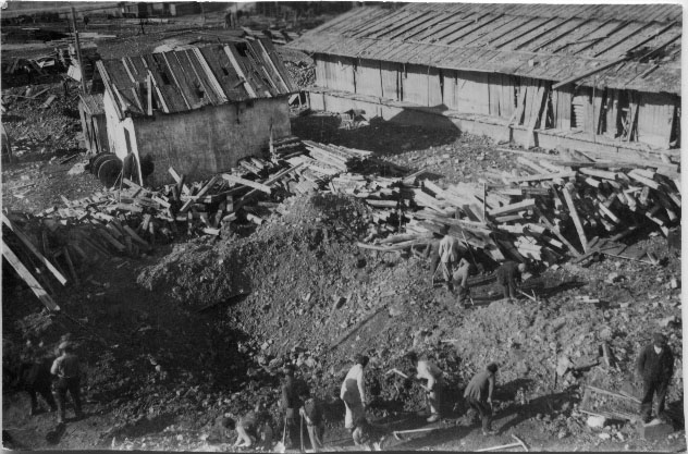 Des requis, et peut-être des prisonniers, cherchent parmi les décombres suite à un bombardement à Laleu à La Rochelle entre 1943 et 1944 pendant la Seconde Guerre mondiale.