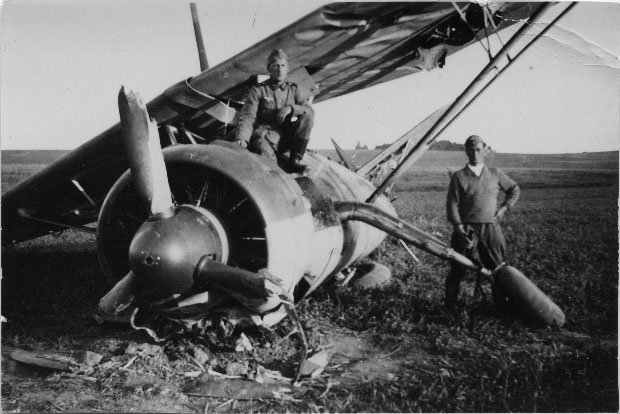 Soldats allemands sur un avion allemand Henschel HS 126 abattu en 1940 à Laleu