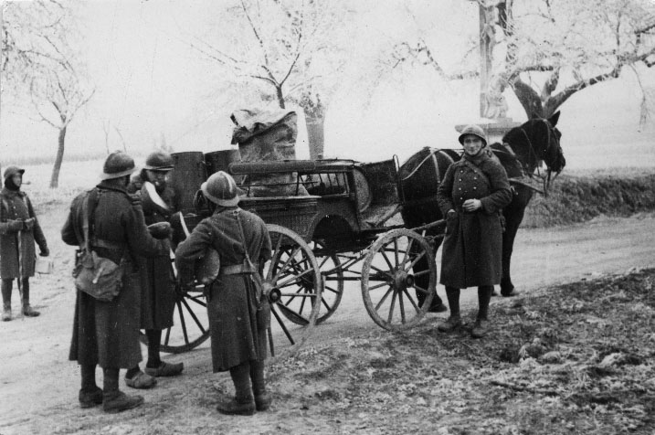 Soldats français posant devant une carriole contenant des boules de pain pour le ravitaillement en hiver 1939 sur le front quelque part en France