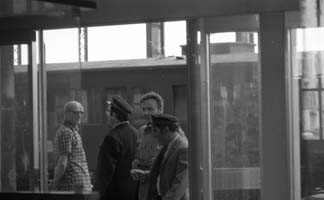 Le comédien Maurice Biraud et quelques figurants dans la gare de La Rochelle lors du tournage du film "Le train" de Pierre Granier-Deferre du 13 au 16 juillet 1973