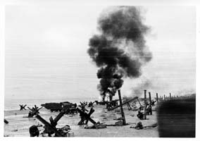 Plage en feu pour les besoins du tournage du film "Le jour le plus long" sur la plage de l'île de Ré (St Clément des Baleines ou Rivedoux) entre 1961 et 1962