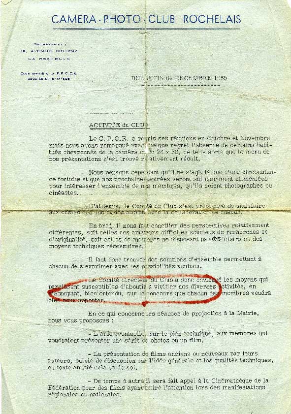 Bulletin (page 1) du Caméra Club Rochelais datant de décembre 1965