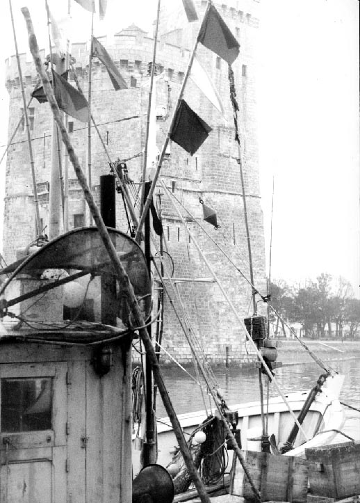 Vieux Port de La Rochelle avec bateaux de pêche et petits drapeaux à casier en 1975