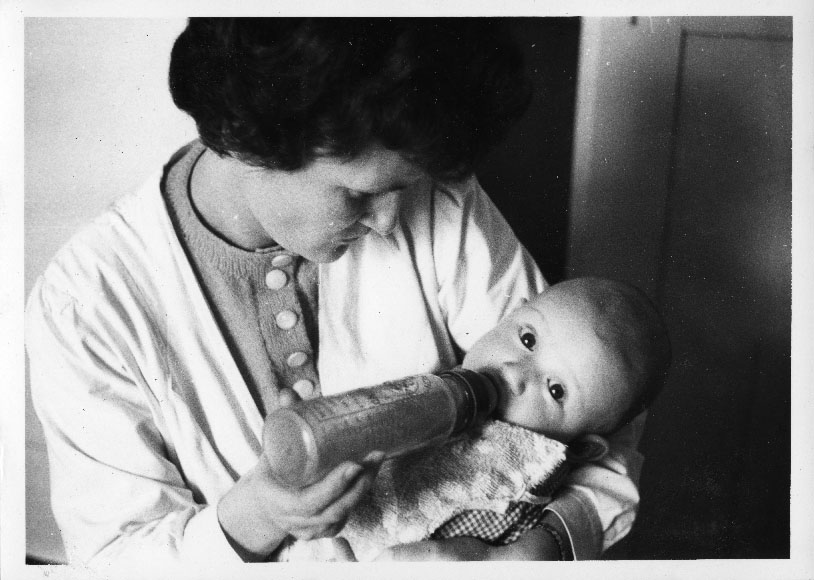 Une maman donne le biberon à son bébé en 1959 à La Rochelle