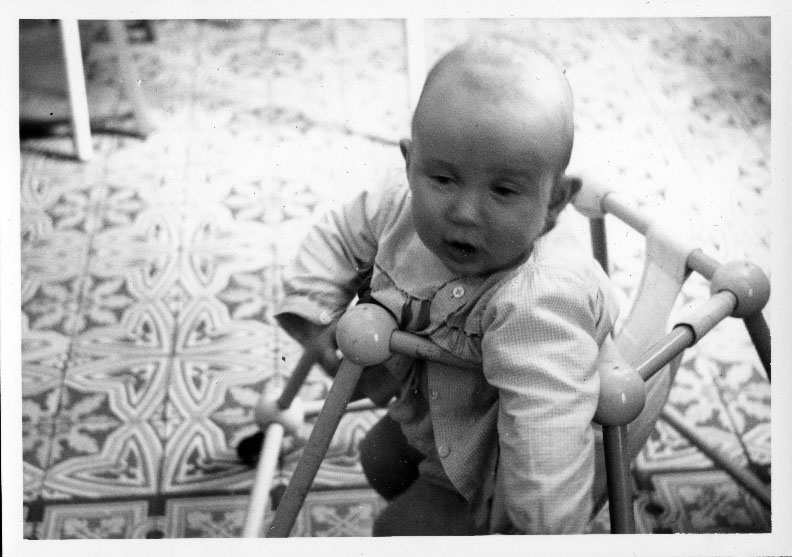 Un bébé sur son trotteur à La Rochelle en 1960