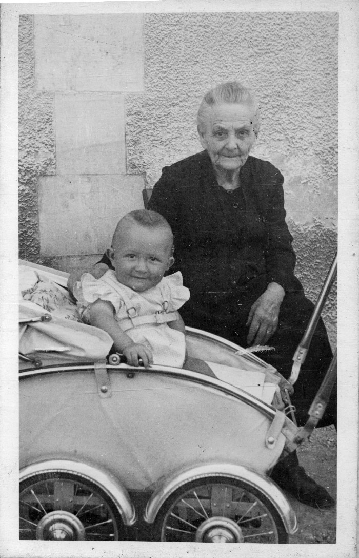 Un bébé dans sa poussette avec son arrière-grand-mère en 1949 à Aytré