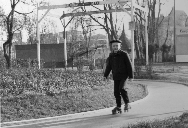Enfant faisant du patin à roulettes sur une piste dans les parcs de La Rochelle en 1960