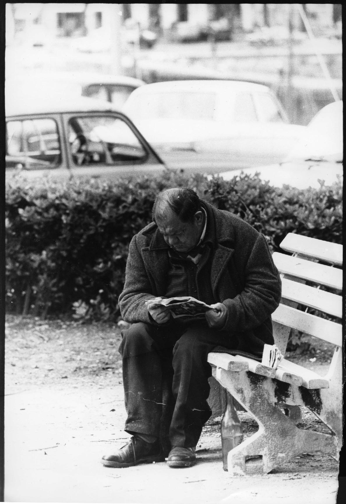 Un homme lit le journal sur un banc à La Rochelle en 1975