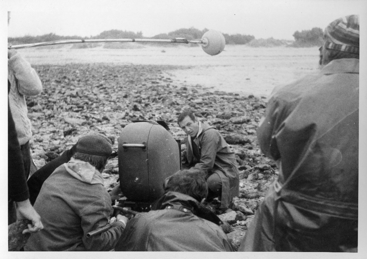 Lino Ventura et l'équipe du film "Les Aventuriers" de Robert Enrico sur l'île d'Aix en 1966