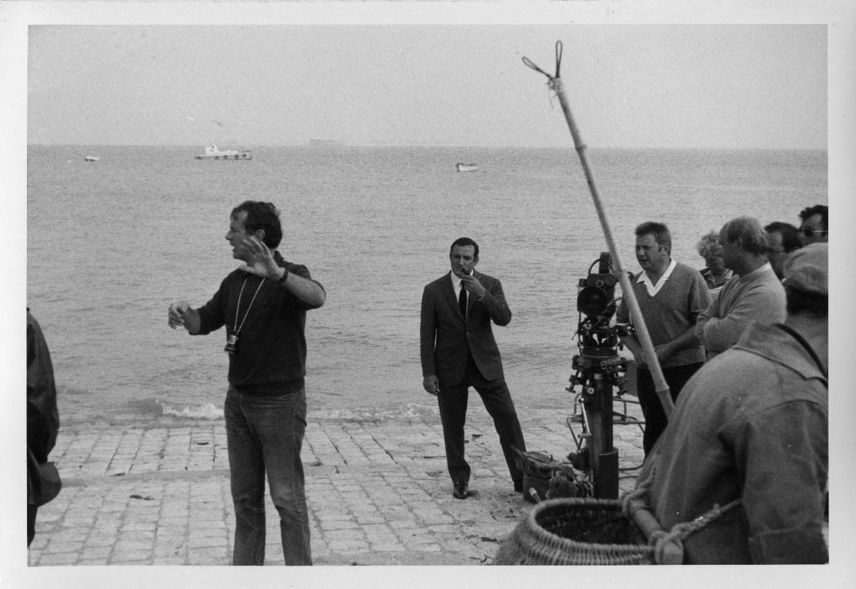 Lino Ventura et l'équipe du film "Les Aventuriers" de Robert Enrico sur l'île d'Aix en 1966