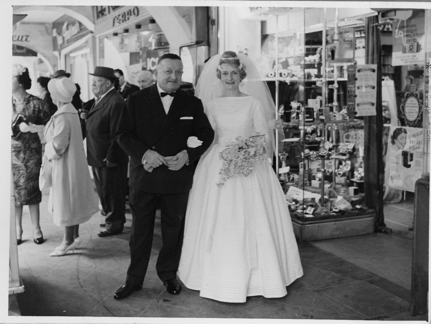 Une mariée et son père devant la vitrine du magasin d'optique et de photo SERPO en 1961 rue Chaudrier à La Rochelle