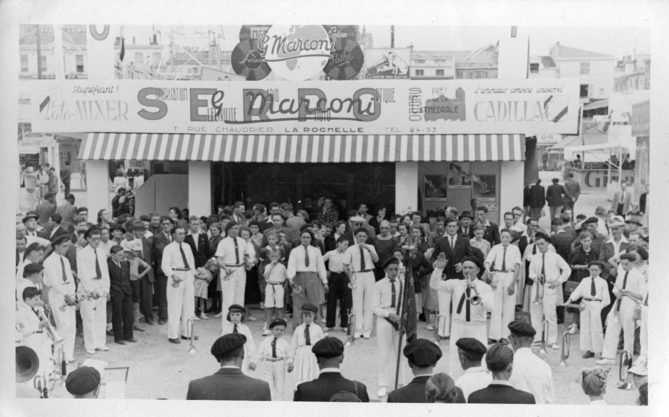 Une fanfare devant le stand SERPO à la Foire Exposition place Verdun en 1950 à La Rochelle