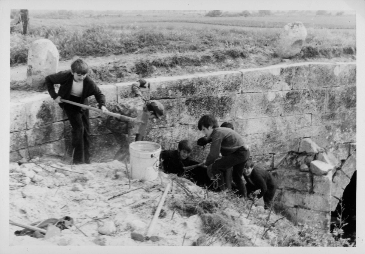 Jeunes garçons pelletant du sable au Pont de la Pierre à Aytré vers 1970