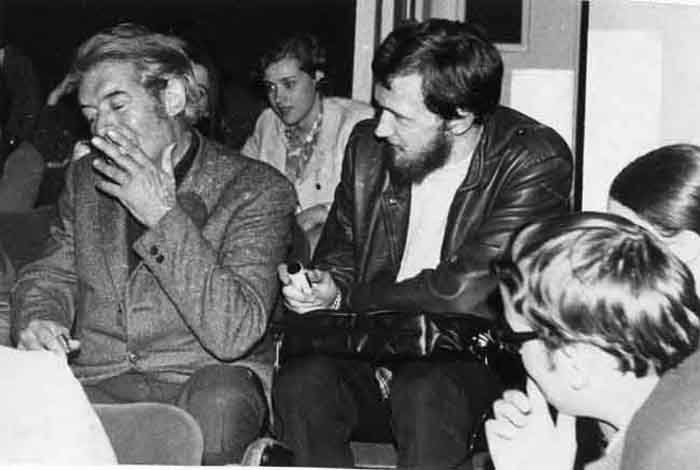 Félix Leclerc interviewé par un jeune homme en 1970 à la Maison de la Culture de La Rochelle
