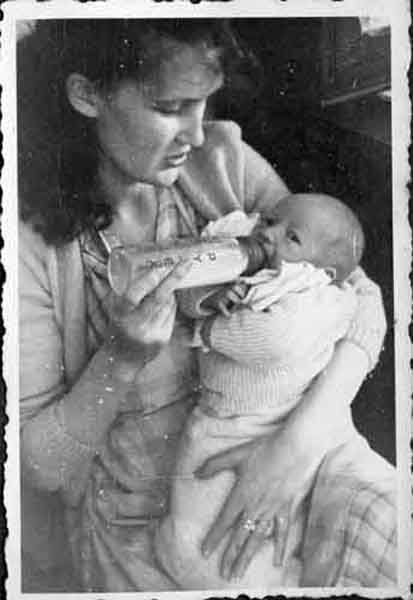 Une maman donne le biberon à son bébé en 1948 à Aytré