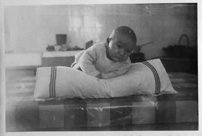 Un bébé allongé sur le ventre en 1948 à Aytré