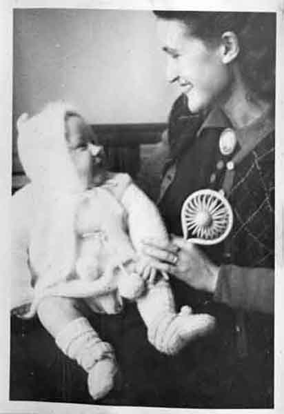 Un bébé regarde tendrement sa maman qui a un hochet dans la main entre 1948 et 1951 à La Rochelle