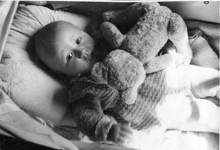Un bébé dans son lit avec ses peluches entre 1948 et 1951 à Aytré