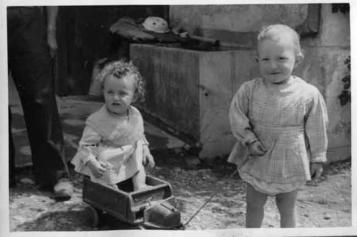 Deux enfants jouant avec une voiture en bois à roulettes entre 1948 et 1951 à Aytré