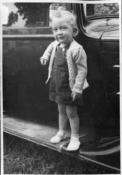 Un petit enfant sur le repose-pied d'une voiture entre 1948 et 1951 à La Rochelle