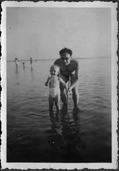 Un papa et son fils en maillot de bain sur la plage d'Aytré entre 1948 et 1951