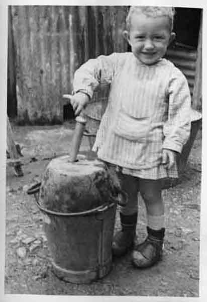 Petit enfant tenant un plantoir et joue à agrandir le trou d'une bassine percée à Aytré en 1950
